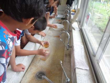 地面の中に見られる土の様子について、水の中に沈めながら観察しています。