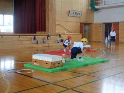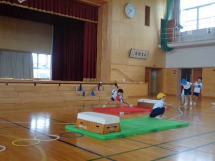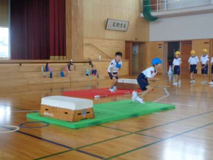 跳び箱を跳び越え、マットの上でポーズ。学習発表会に向けて、忍者の特訓中です。
