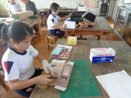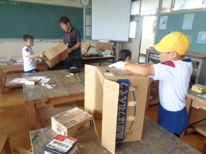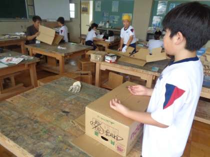 版ボールを利用して、いろいろな物入れを作ります。まずはアイディアを考えながら作品のイメージを膨らませ、作業を進めています。どのような作品になるのか楽しみです。