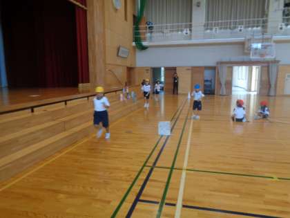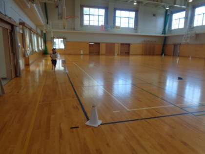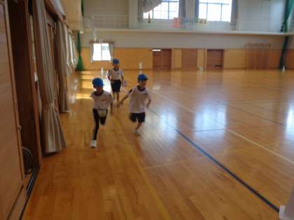 RUNRUN記録会の練習にチャレンジ。ほとんどの子が3分間に体育館を4周走ることができました。すごい!