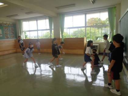 2学期初めてのなかよし班活動。あいにくの雨模様で、グラウンドでの活動はできませんでしたが、リーダーを中心に仲良く活動していました。