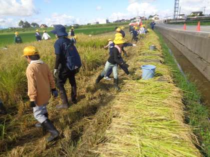 最後は5年生が刈り取った稲をコンバインに運び、脱穀をしていただきました。収穫の喜びを味わうことができたのも、高木様をはじめ、米つくりに携わっていただいた地域の方々、JAの方のおかげと感謝いたします。ありがとうございました。