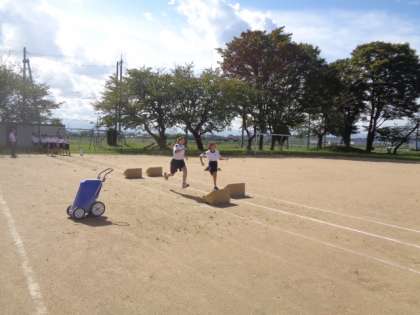 グラウンドでスピードを落とさずにリズムよく走る練習です。