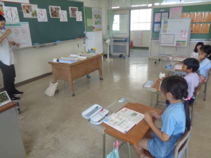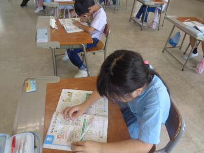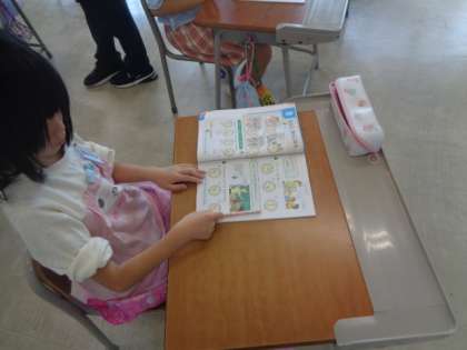 時計の学習をしています。短い針の指す数字に注目して、何時を表してるのか考えています。