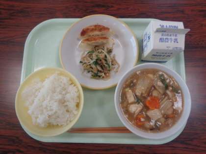 今日の献立は、ご飯 えびと豆腐のうま煮 焼き餃子 ナムル 牛乳 でした。