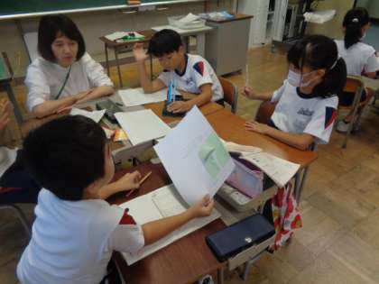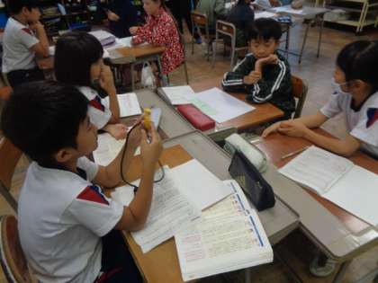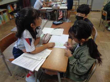 「1年生と3年生が楽しめる読み聞かせ」をテーマに、グループで話し合っています。司会役や時計役を決めながら、ポイントを絞った話合いがさています。