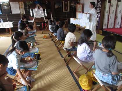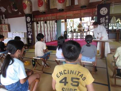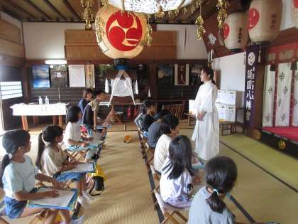 生活科の町探検で八幡宮に行きました。八幡宮や働いている人についてたくさんお話を聞かせてもらいました。神様についての話や、この場所に八幡宮ができたわけなど、とても興味津々な様子でした。話を聞く中で「神様はどうして見えないのか」「昔、旗で敵を追い払ったとき、何色の旗があったのか」など、疑問に思ったことをたくさん質問していました。