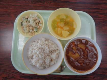 今日は、食べキリンハヤシ、 麦ご飯  大豆サラダ  フルーツゼリーミックス  牛乳  でした。