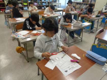 冬植えする野菜の種の様子を虫眼鏡で観察しています。