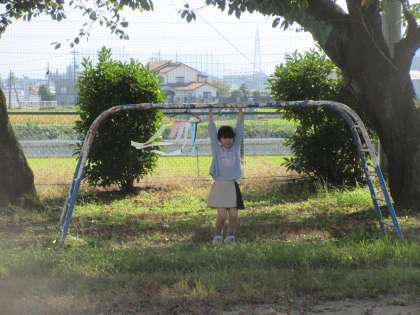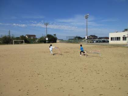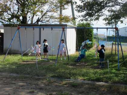 学習で作った作品を持って、外に出て活動しました。グラウンドを走ったり、遊具にかけてひらひら揺れる様子を見たりして楽しんでいました。