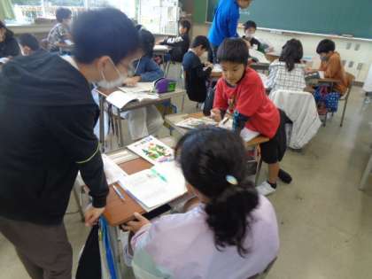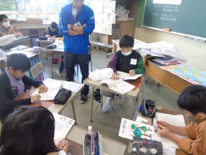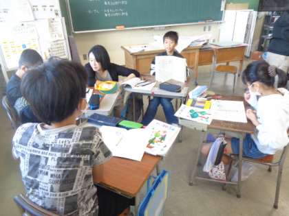 表にして変化する2つの数値の法則を見付け出して考えた答えの見つけ方を、グループで紹介し合っています。