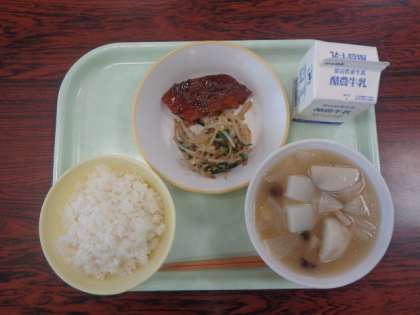 今日の献立は、ご飯 赤魚の照焼 芋のこじる 香味和え 牛乳 でした。