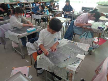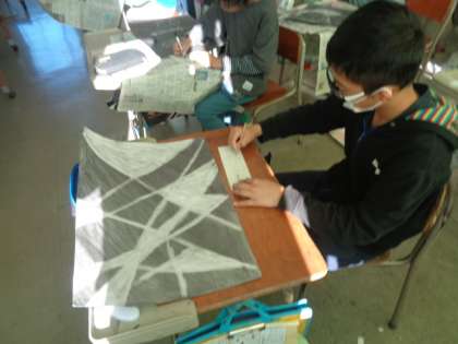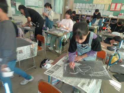 鉛筆を擦って広がった下地を、消しゴムで跡をつけながら作品に仕上げていきます。各人テーマに合わせた作品を製作中です。