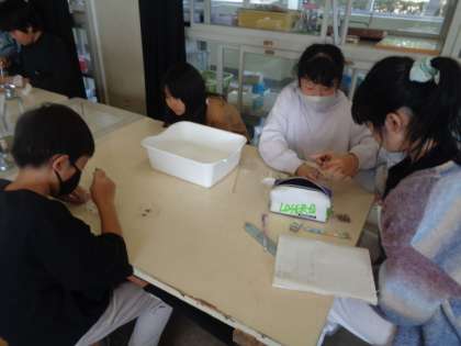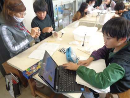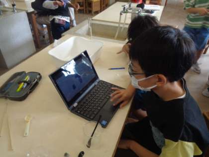 水の量がちがうと、塩とミョウバンの溶ける量が違うのだろうか。根気よくかき混ぜ、溶けた量の記録をPCに入力しています。
