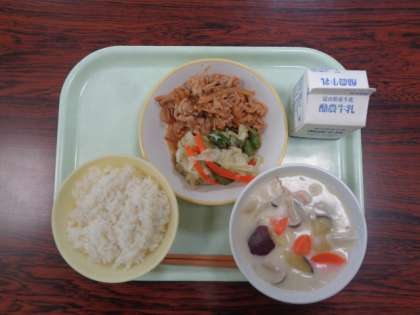 今日の献立は、ご飯 秋の香りのシチュー ポークチャップ アスパラサラダ 牛乳 でした。