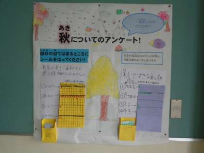 1年生は、図画工作科で自分たちがつくった作品を紹介しようと、給食時間の放送で伝えました。4年生は、「秋」をテーマにした新聞を掲示して、アンケートに答えて欲しいと伝えました。素敵なはたらきかけです。