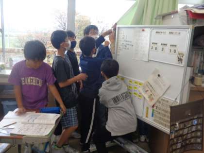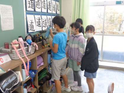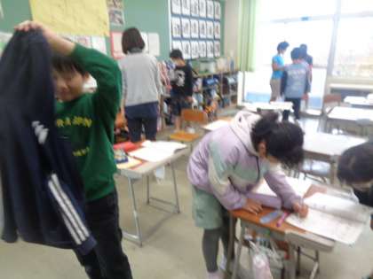 教室内にある環境に関わる表示マークを探しています。身の回りにあるたくさんの物が、環境を意識したものだということが分かりました。