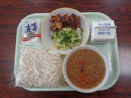 今日の献立は、ソフト麺の肉味噌  大学芋  野菜のドレッシング和え  味付け小魚