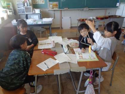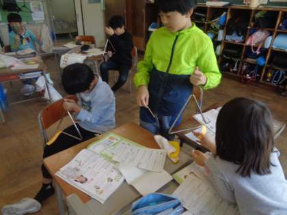トライアングルを強弱を変えてたたくと、伝わる紙への振動は違うのか、確かめています。