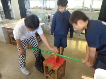作用点、力点、支点の位置を変えながら、重さを感じる力について確かめています。