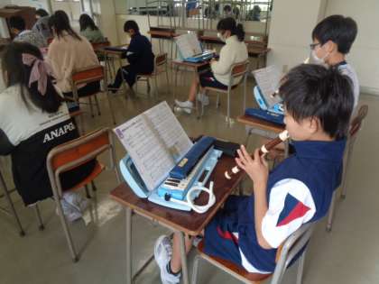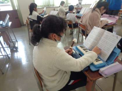 「キリマンジャロ」のリコーダーと鍵盤ハーモニカの音階をチェックしています。