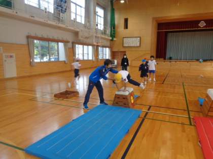 富山市スポーツ協会指導員の方をお招きし、跳び箱教室が行われました。初めに3・4年生は、踏み切りの仕方や手のつきかたや力の入れ方などを教えていただき。きれいな姿勢で開脚跳びや台上前転ができる子供たちが増えました。