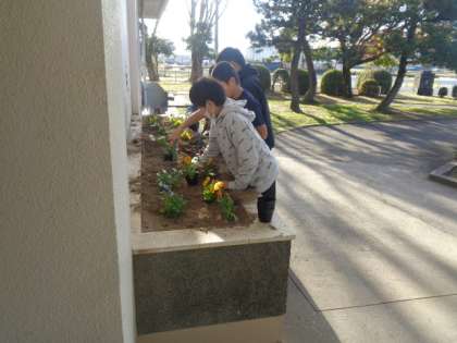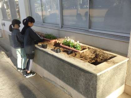 朝活の時間に生活委員の人が、正面玄関前の花壇の花を植えています。一気に明るい様子になりました。