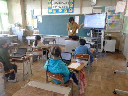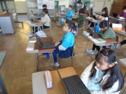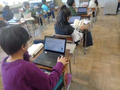 たくさんの漢字を集めてつくった文をPCに入力し、みんなで紹介し合っています。