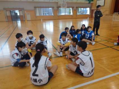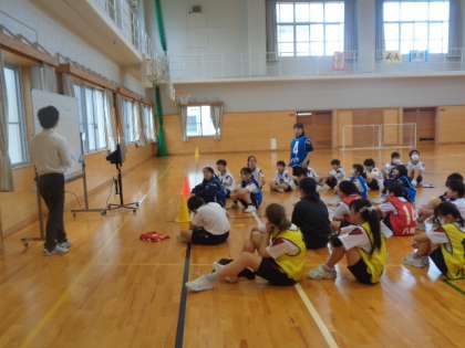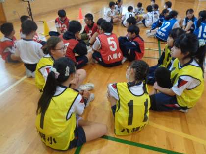 ハンドボールゲームの最終戦終了後、お互いの動きのよかった点や自分の動きで足りなかった点などを、しっかり話し合っています。