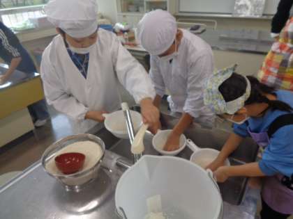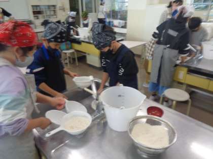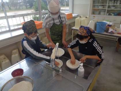 5年生は、全校分の餅米の準備をしています。心を込めて丁寧に餅米をといでいます。
