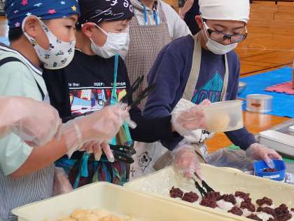 5年生は、ふれあい餅つき大会で様々な活動をしました。餅を切ったり、あんこやきな粉をまぶしたり、弁当箱の中に詰めたりするなどたくさんの活動です。