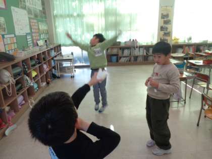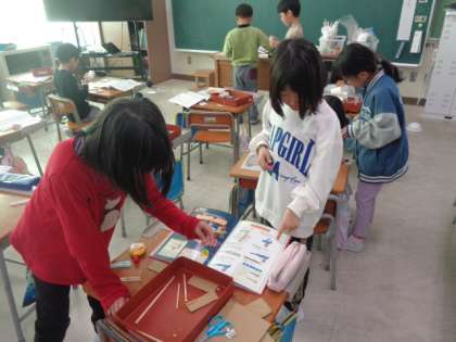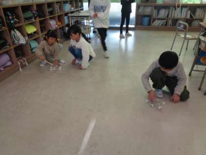 身近にある容器などを使って、楽しいおもちゃ作りに取り組んでいます。上手く飛んだり進んだりするよう、微妙な調整が必要です。
