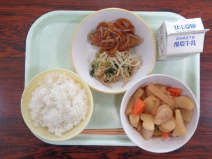 今日の献立は、ご飯 関東炊き 魚の黒酢あん もやしのおひたし 牛乳 でした。