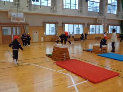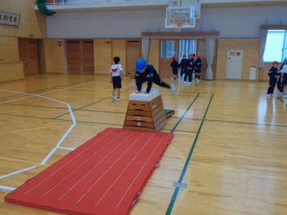 跳び箱で開脚跳びに挑戦です。跳び箱教室で教わったことも生かし、姿勢がとてもきれいです。