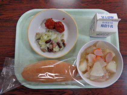 今日の献立は、コッペパン 野菜のスープ ミートボール ミックスビーンズのマリネ 棒チーズ 牛乳 でした。