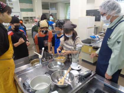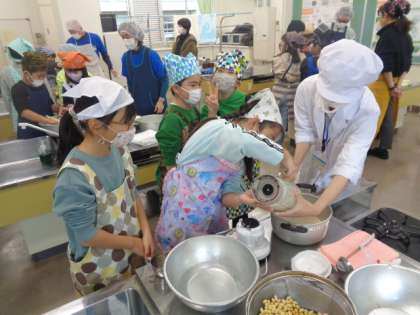 国語科や総合的な学習の時間の一環として、講師の方をお招きし、豆腐づくり体験をしました。大豆をくだき、あたためていくうちに豆腐のもととなる豆乳とおからに分離され、段々と豆腐が出来上がっていく過程に、子供たちは驚いていました。