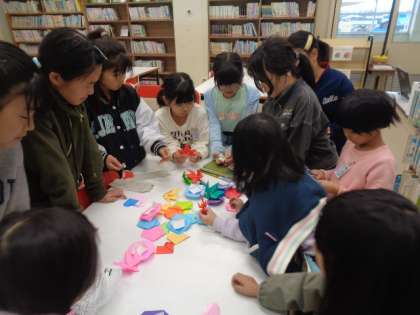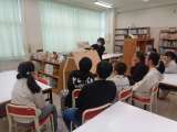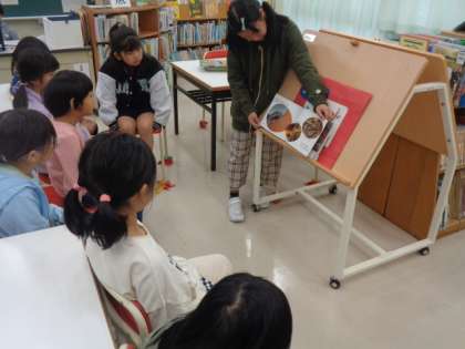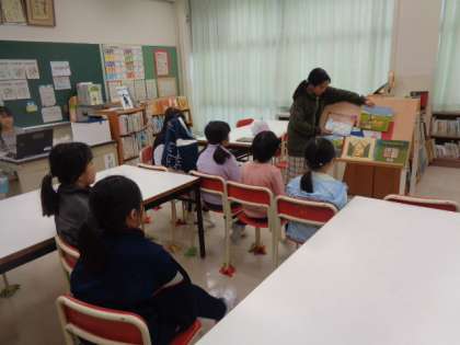 休み時間に情報委員に読み聞かせがあり、1年生を中心に、たくさんの人が参加しました。終わりにプレゼントも。とてもうれしそうです。