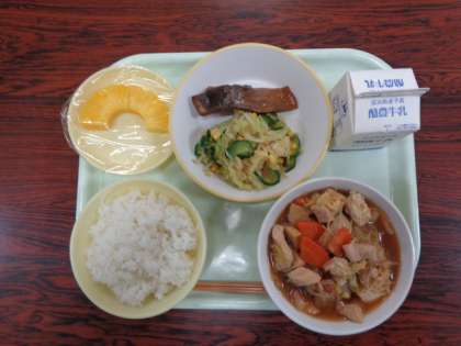 今日の献立は、ご飯 鶏のすき焼き 鰺のみりん焼き コーン和え パインアップル 牛乳 でした。