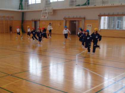 シャトルランに挑戦です。リズムよく、テンポよく走り、記録をのばしていきました。最高記録は、何と64回だったそうです。がんばりました。