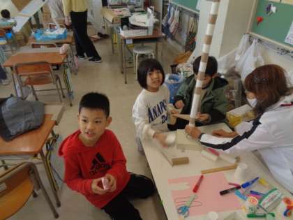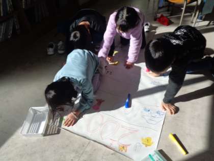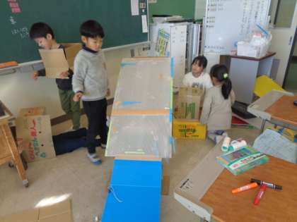 自分たちが作ったおもちゃを生かした「おもちゃフェスティバル」の計画・準備をしています。他の学年の人たちに紹介、喜んでもらえるよう、内容を考えています。