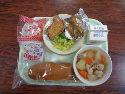 今日の献立は、セレクトメニューでした。コッペパン  ポトフ  添え野菜  ハムカツまたは揚げ魚のレモン味  いちごのカップケーキまたはガトーショコラ  牛乳  でした。