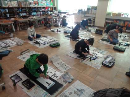 3年生にとって、初めての書き初めです。まずは、場所を整え、姿勢良くお手本を見ながら丁寧に書く練習です。