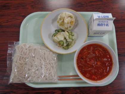 今日の献立は、ソフト麺のミートソースがけ 白菜とりんごのサラダ 蒸しパン 牛乳 でした。