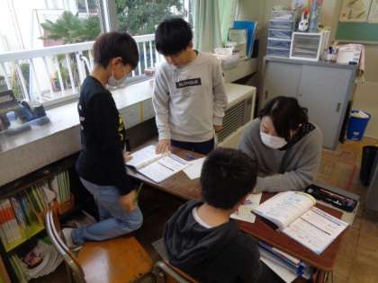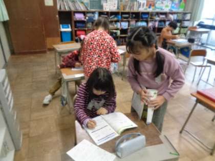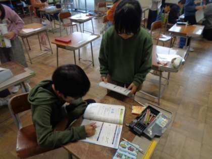 学習した内容を子供たち同士で教えあいながら確認しています。