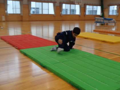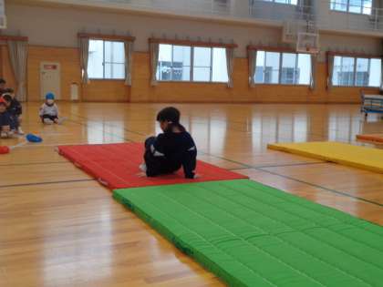 マットでできる技の発表会です。いろいろな回転技を組み合わせて、楽しそうに自信を持って発表しました。