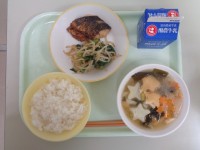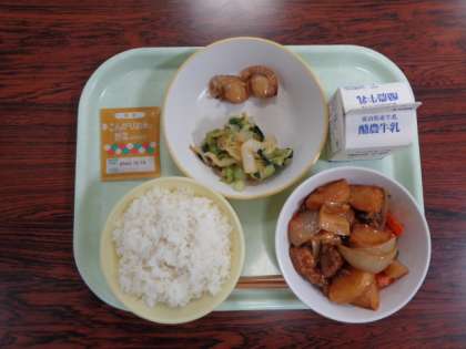 今日の献立は、ご飯 酢豚 ほたての香味焼き 生姜ひたし 野菜ふりかけ 牛乳 でした。