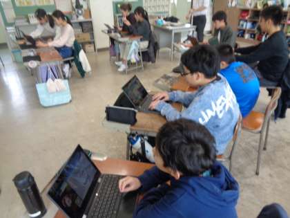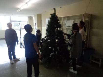 保護者の方にいただいた、「クリスマス・ツリー」を6年生が組み立てると、天井に迫るくらい大きさでした。早速、飾り付けを募集するためのポスター考えています。