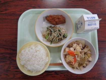 今日の献立は、ご飯 白菜鍋 揚げ魚のみぞれだれ 昆布和え 牛乳 でした。