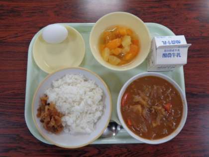 今日の献立は、カレーライス ゆで卵 福新漬け フルーツゼリーミックス 牛乳 でした。