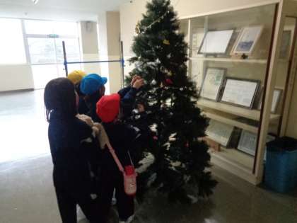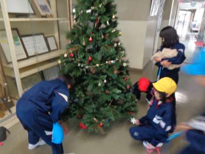 今週から登場したクリスマス・ツリー。6年生の呼びかけのおかげで、随分と飾りが増え、にぎやかになってきました。